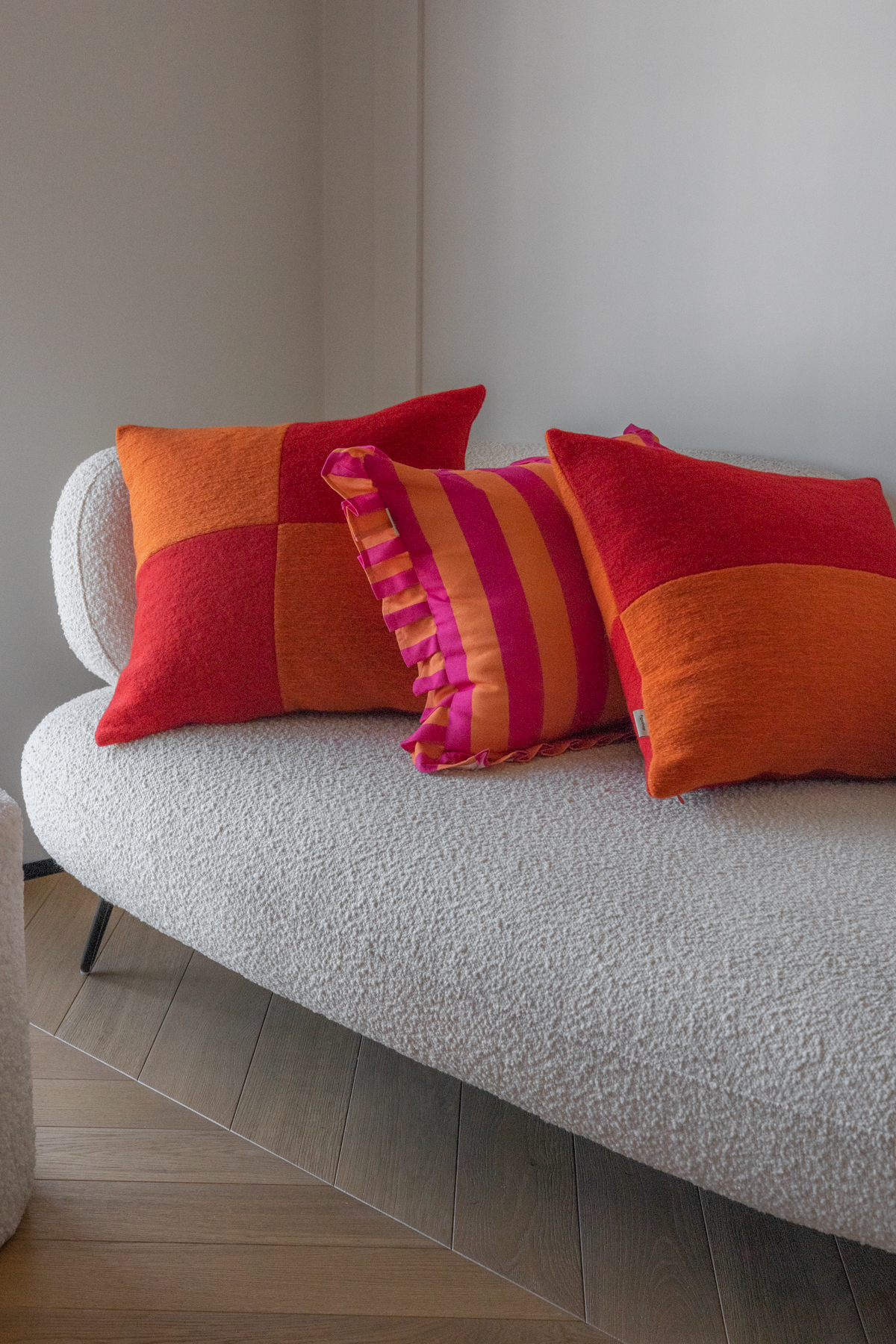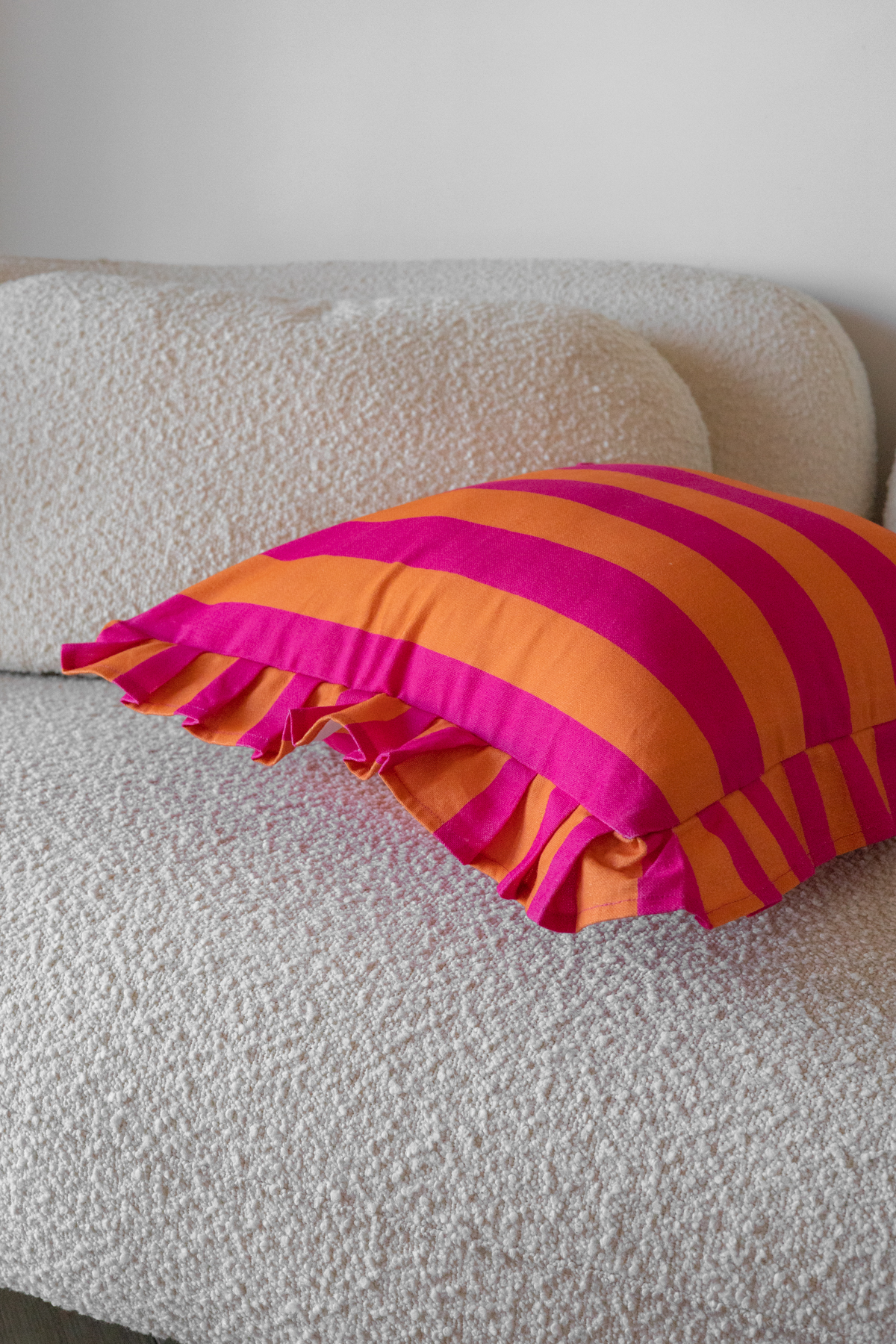 Poszewka dekoracyjna z wysokiej jakości tkaniny w grube, malinowo – pomarańczowe pasy. Solidny materiał w 100% bawełniany. Poszewka obszyta grubą falbanką. Wykonana z wielką starannością. Poszewka dekoracyjna zamykana na kryty zamek.