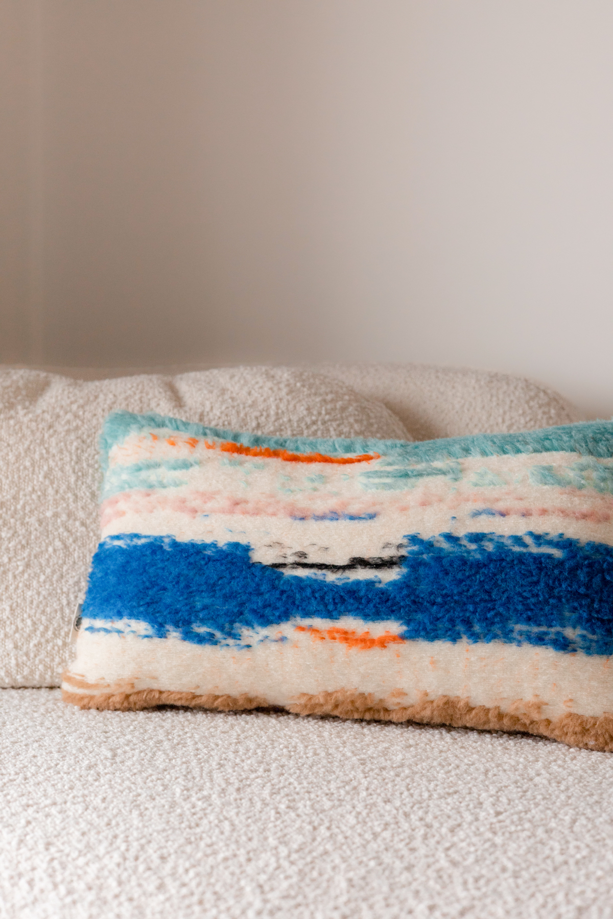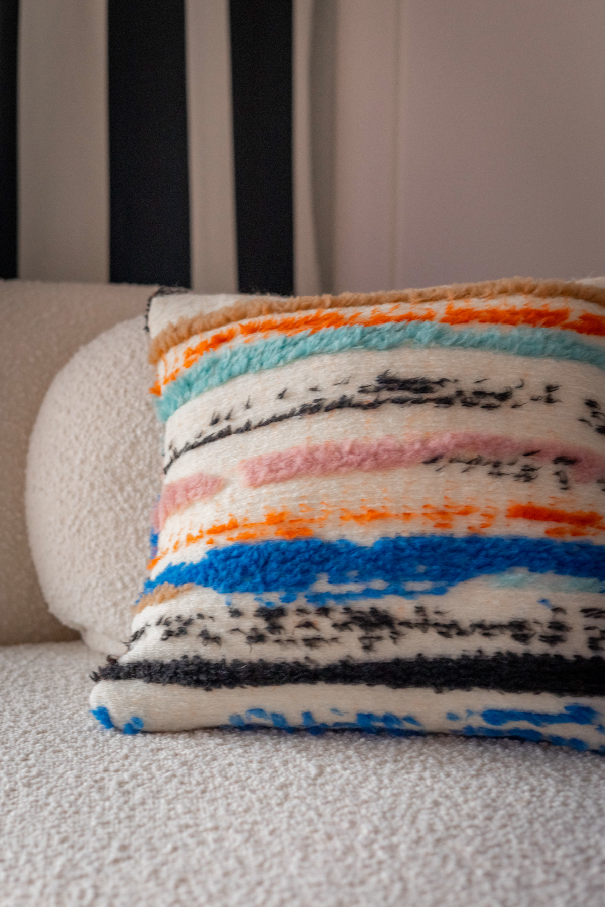 Wełniana poszewka dekoracyjna z pięknej, wielokolorowej dzianiny. Masywny, tęgi i przyjemny w dotyku materiał w kolorowe pasy.