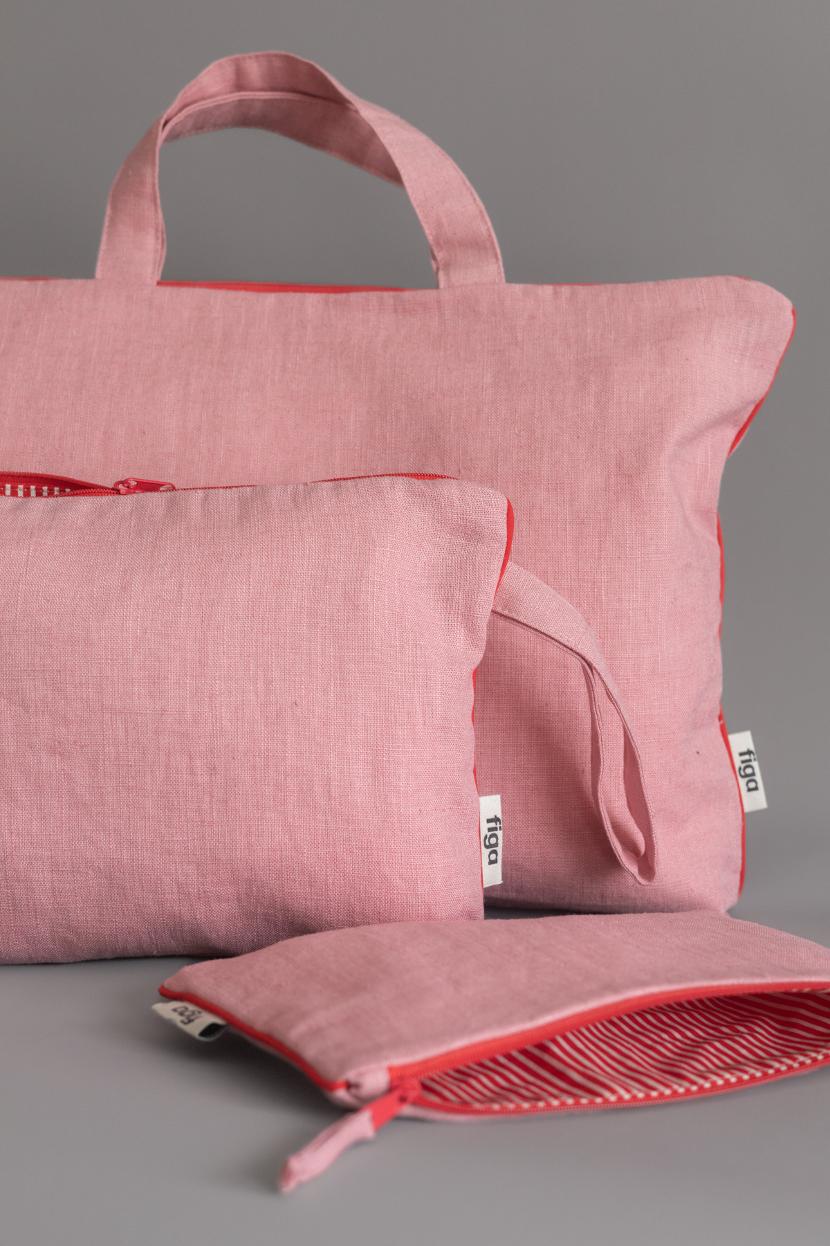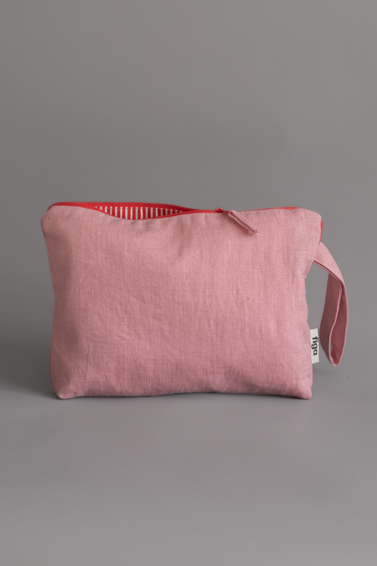 Lniana, dwuwarstwowa kosmetyczka z lamówką, zamykana na suwak. Kosmetyczka wykonana z tkaniny lnianej o wysokiej gramaturze (ok. 280g/m2). Zewnętrzną stronę tworzy naturalny len o grubym splocie w soczystym różowym kolorze. Wewnątrz sztywna tkanina bawełniana w czerwono-białe paski. Praktyczny uchwyt z boku oraz mała kieszonka wewnątrz.