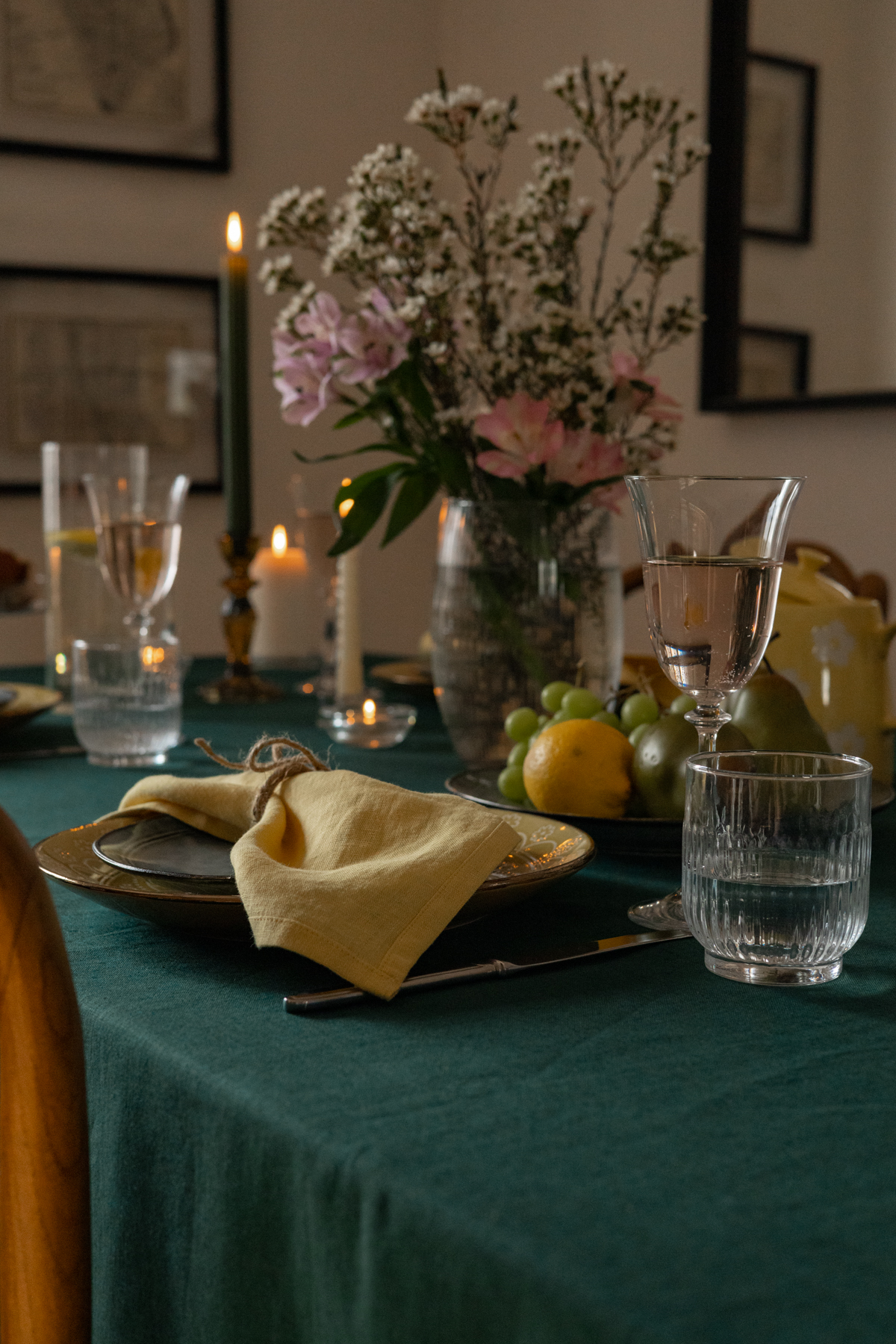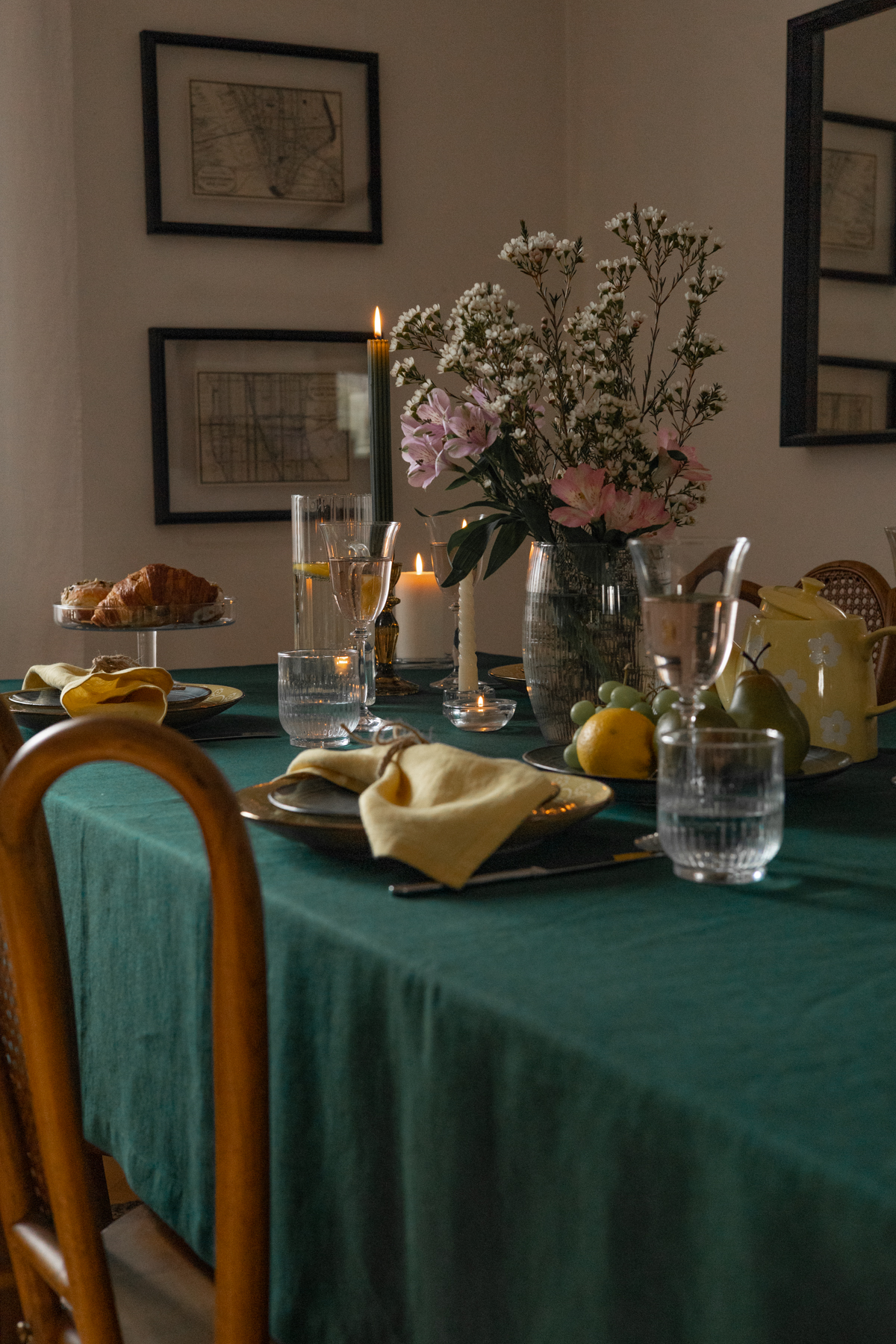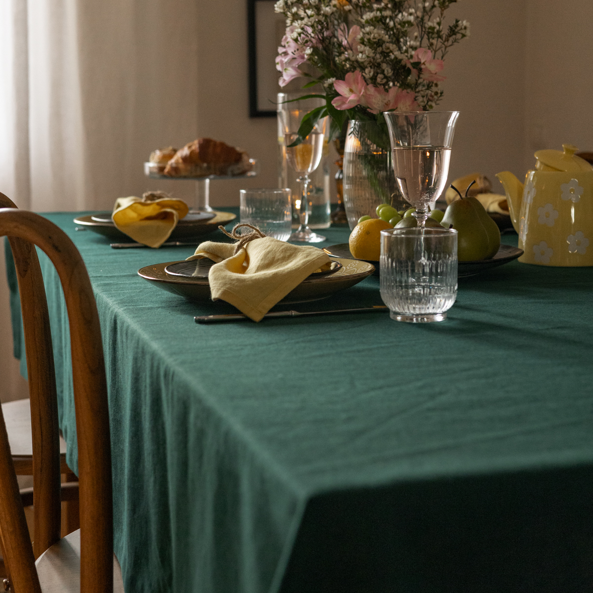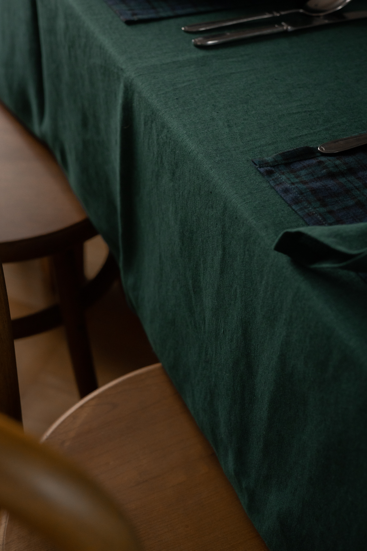Obrus lniany w kolorze butelkowej zieleni. Wykonany z miękkiego lnu o gramaturze 205 g/m2
