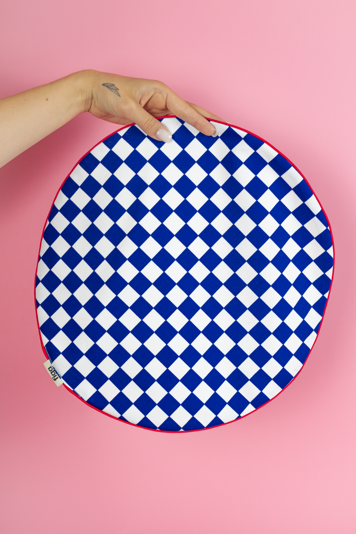 Dwustronna podkładka pod talerz SOL cieszy oko i chroni powierzchnię stołu przed uszkodzeniami. Podkładka lniano – bawełniana w kobaltową szachownicę.