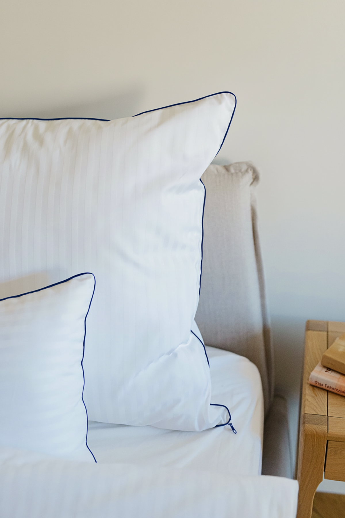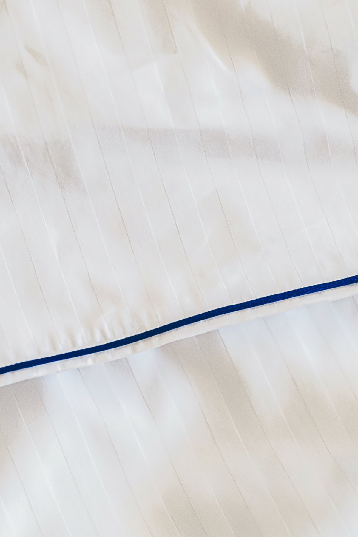 Luksusowa, biała pościel z polskiej bawełny satynowej adamaszek – biała w subtelne paseczki wykończona granatową wypustką.