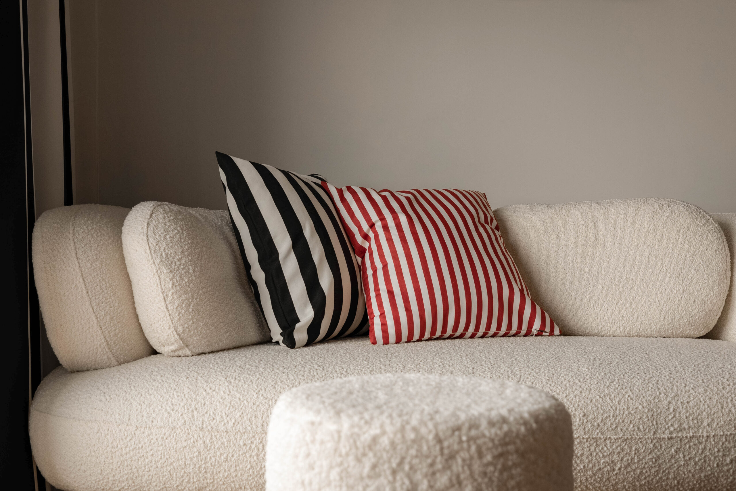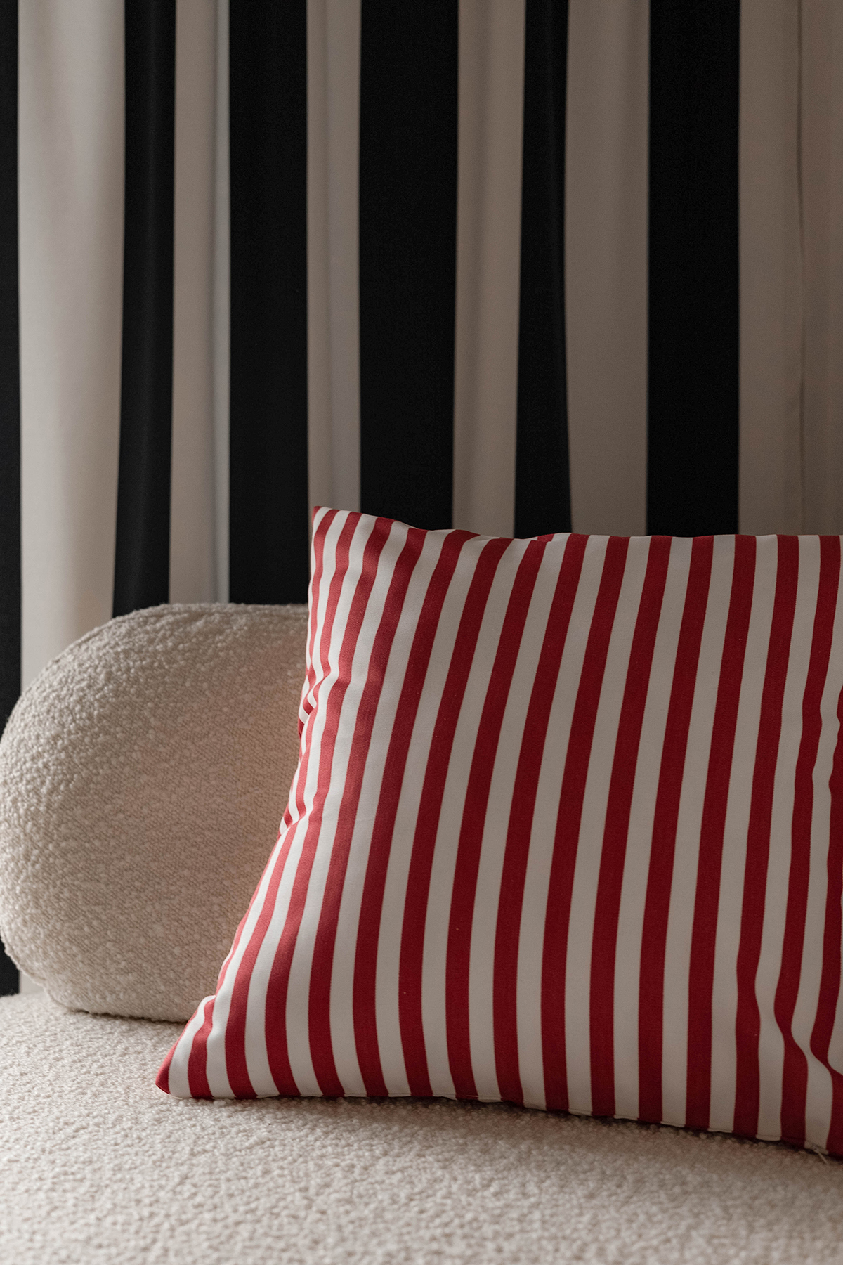 Bawełniana poszewka dekoracyjna w pasy. Masywny, gładki materiał bawełniany w biało-czerwone pasy.
