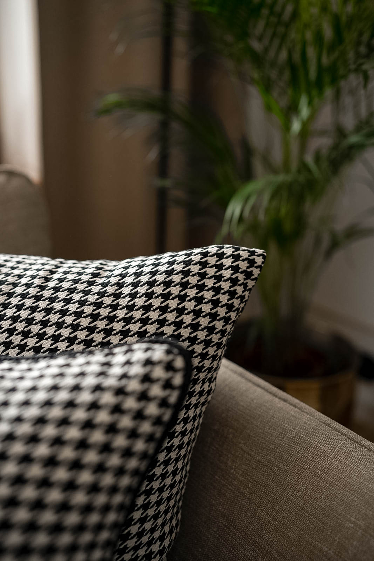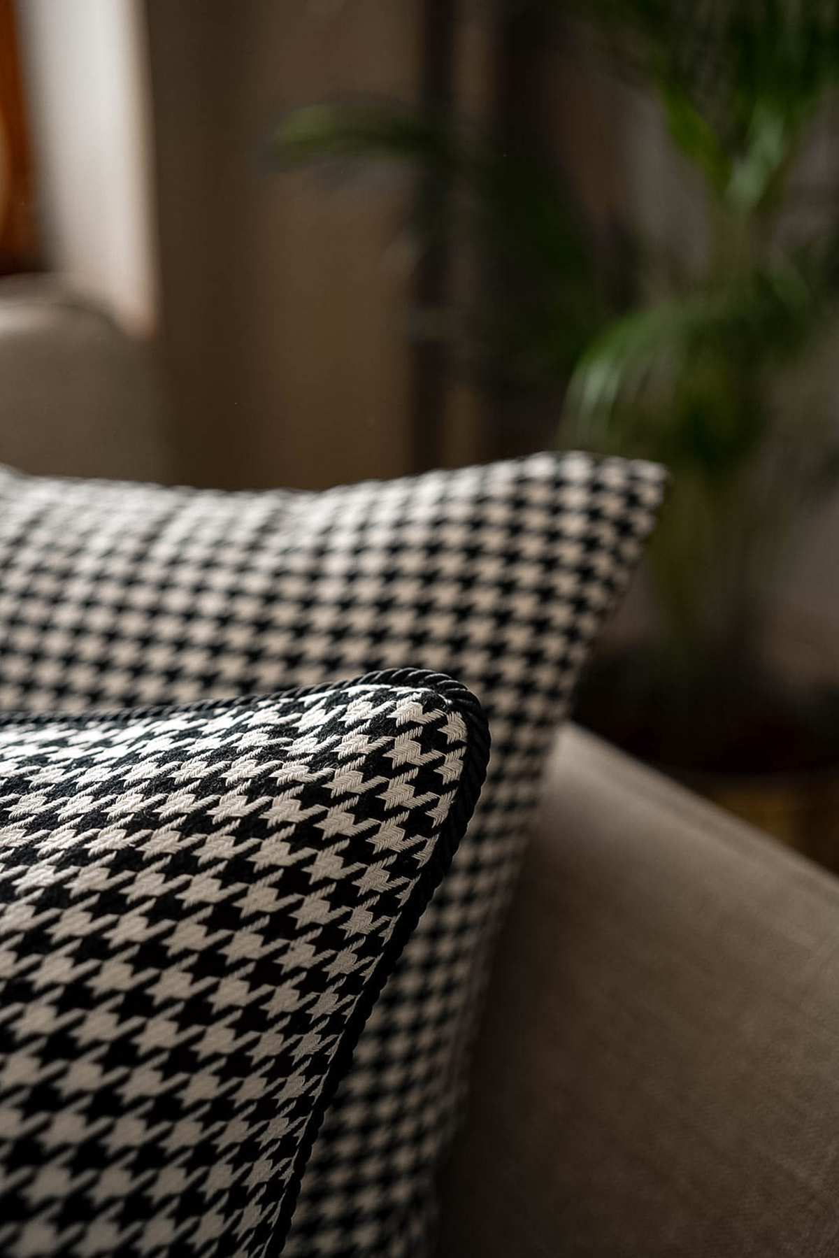 Bawełniana poszewka dekoracyjna w czarno-białą pepitkę. Masywny, tęgi i przyjemny w dotyku materiał.