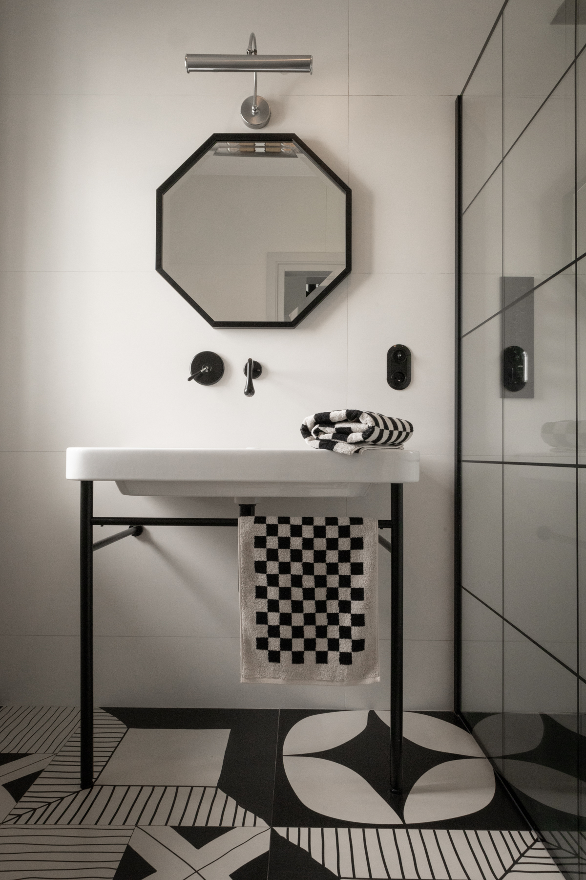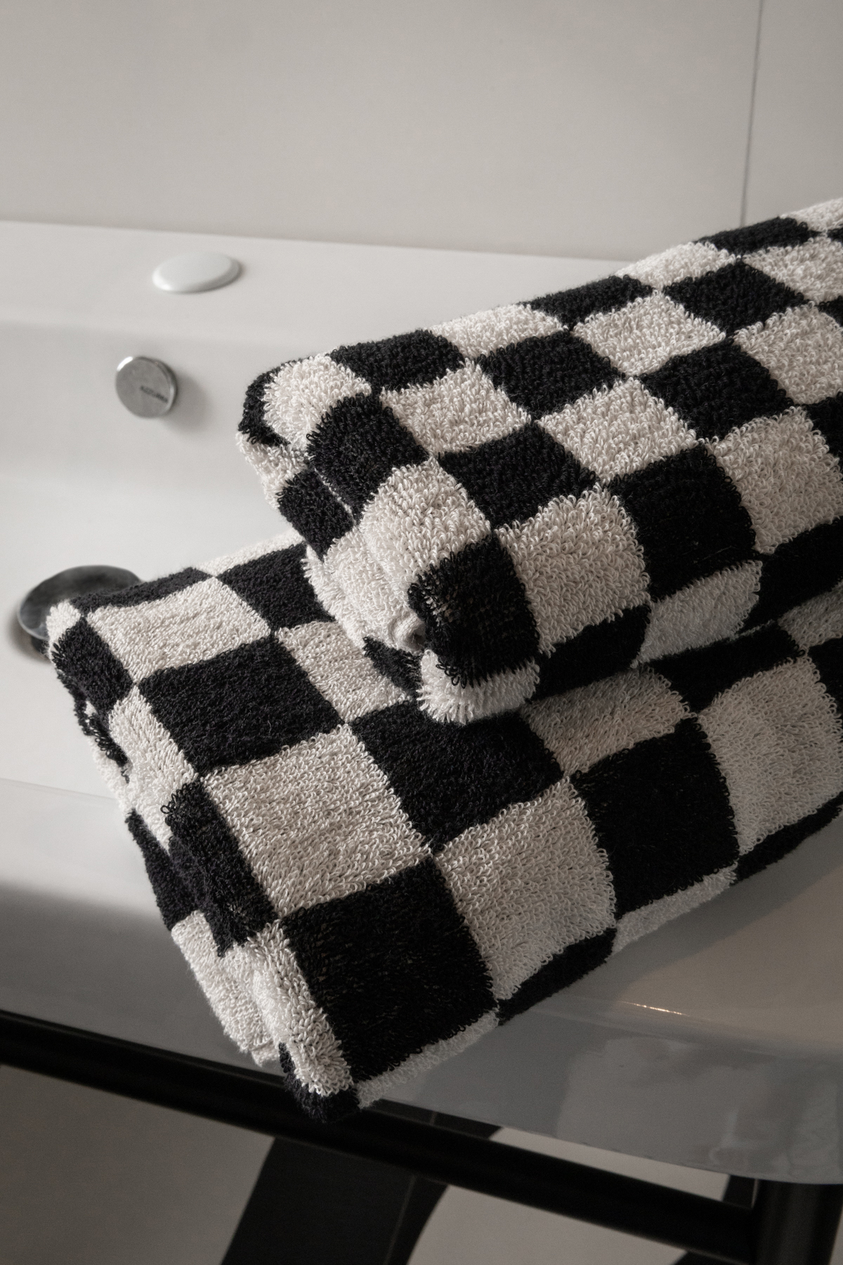 Ręcznik z miękkiej bawełnianej frotté o dużej chłonności. Ręcznik z barwionej przędzy we wzór szachownicy. Kolor czarny oraz szarobiały. Nowoczesny design i wysoka jakość. Posiada pętelkę do zawieszenia.
