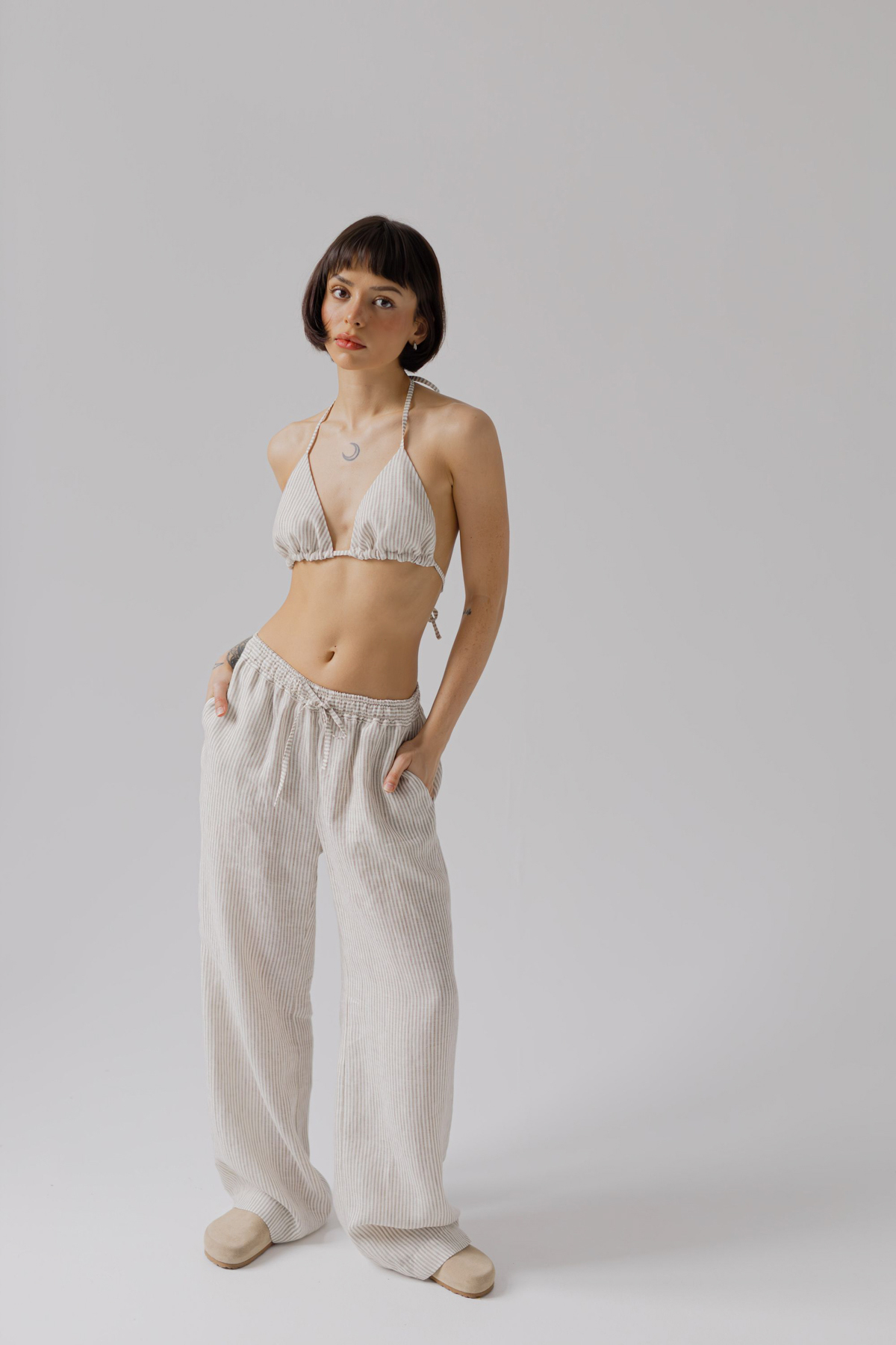 Klasyczne, lekkie, zawsze na miejscu. Spodnie Mary Jane w beżowe prążki to ukłon w stronę prostoty, która nigdy się nie nudzi.
