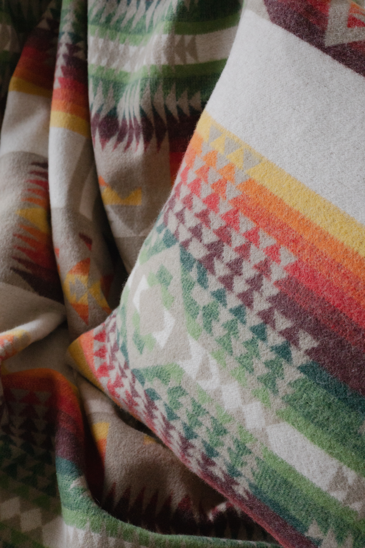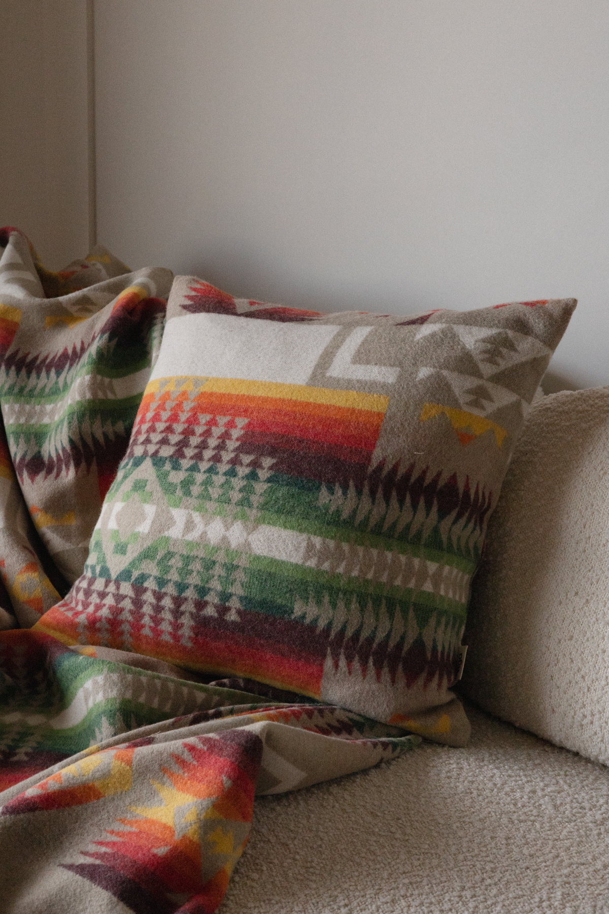 Poszewka dekoracyjna w etniczny, wielobarwny wzór z tkaniny wełnianej. Najwyższej jakości tkanina z gładką strukturą. Poszewka przyjemna w dotyku i nie wymaga prasowania. Wykonana z wielką starannością.