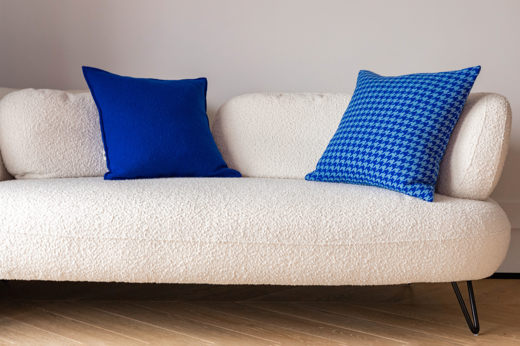 Wełniana poszewka dekoracyjna w kobaltowo-niebieską pepitkę. Masywny, tęgi i przyjemny w dotyku materiał.
