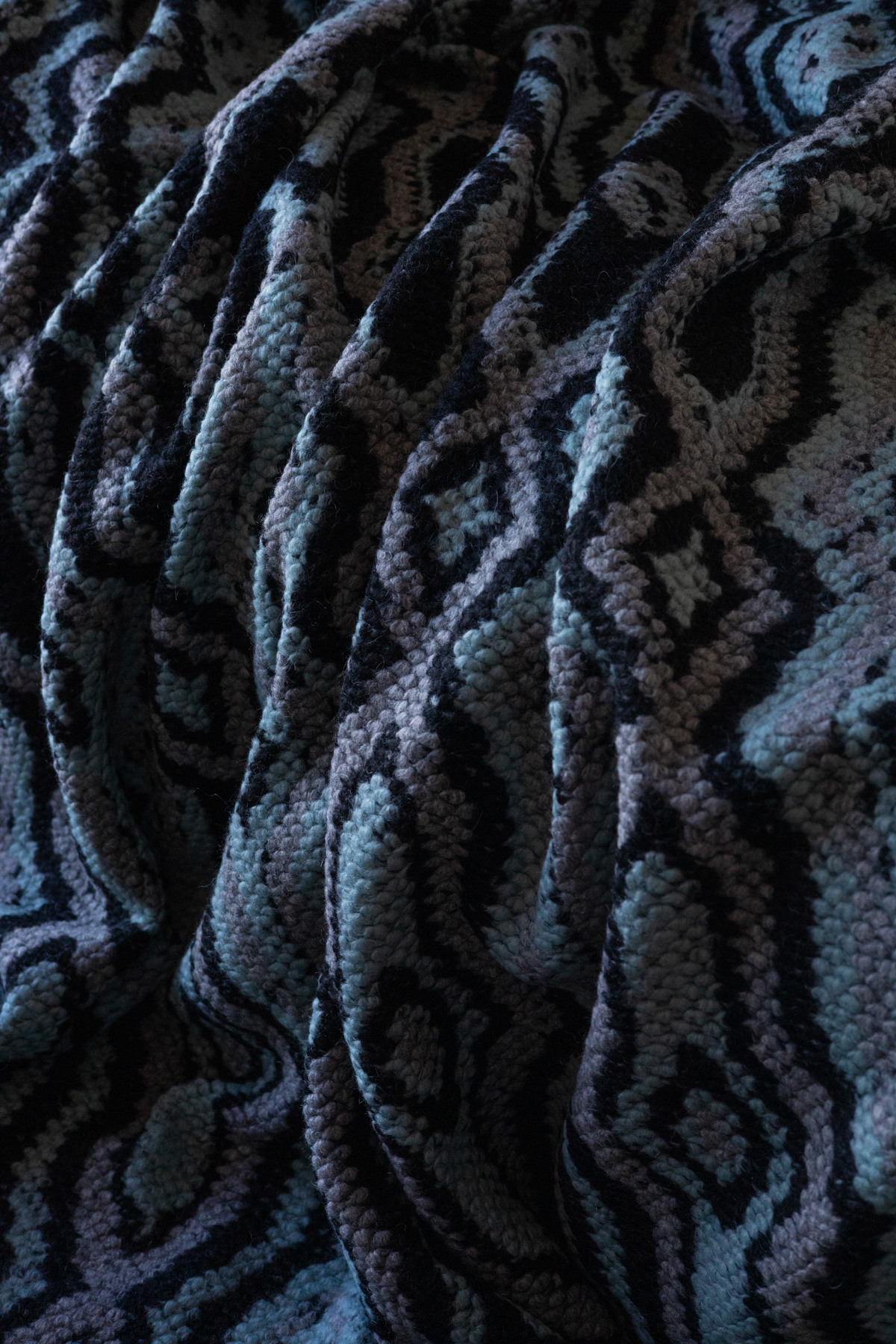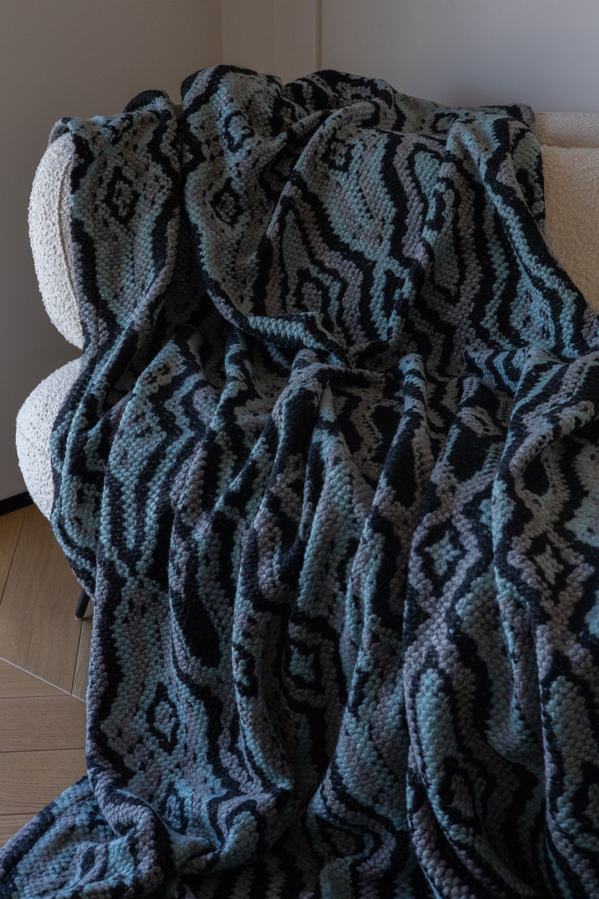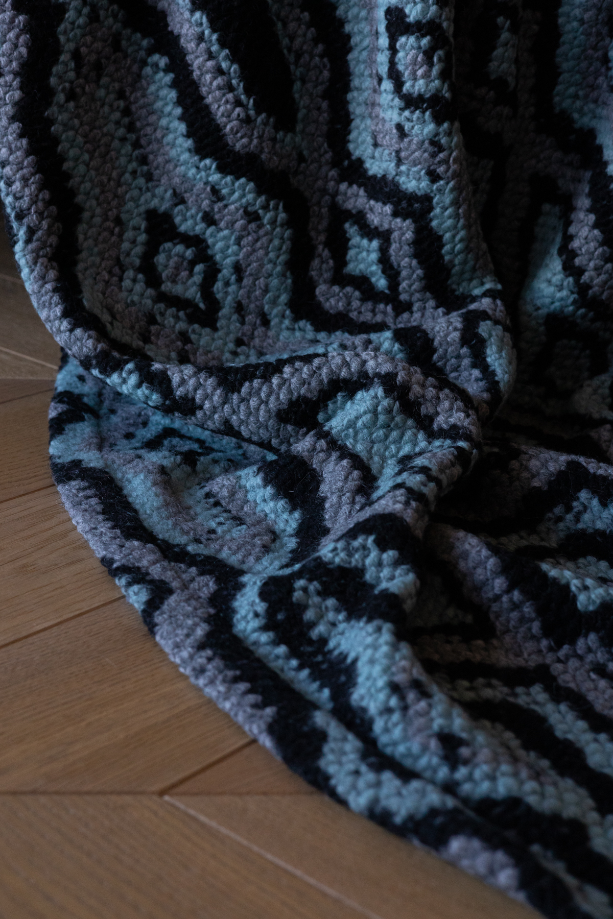 Koc z miękkiej dzianiny wełnianej. Przyjemny w dotyku pled w odcieniach morskiego, czerni i szarości. Stylowa narzuta wełniana do salonu lub sypialni.
