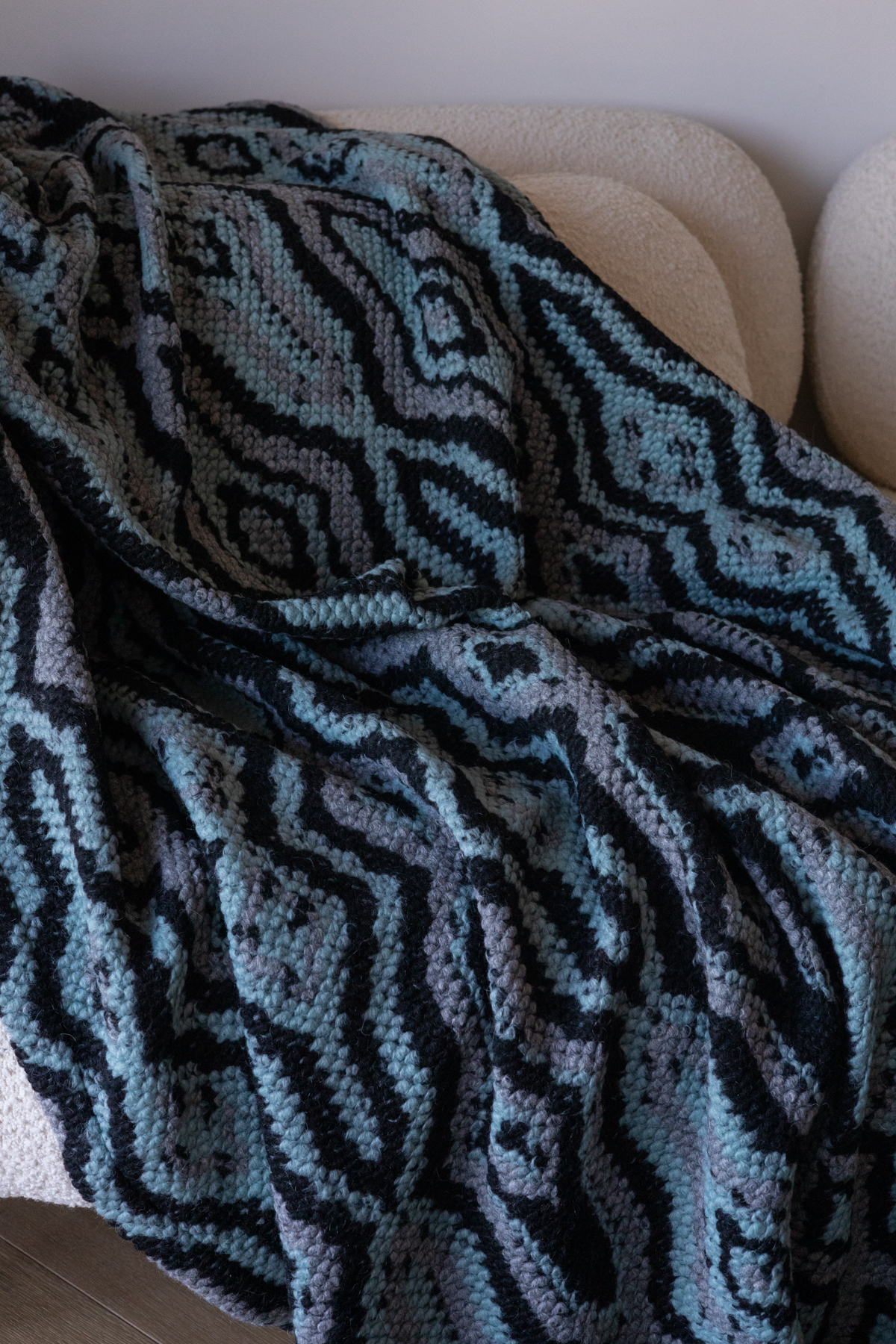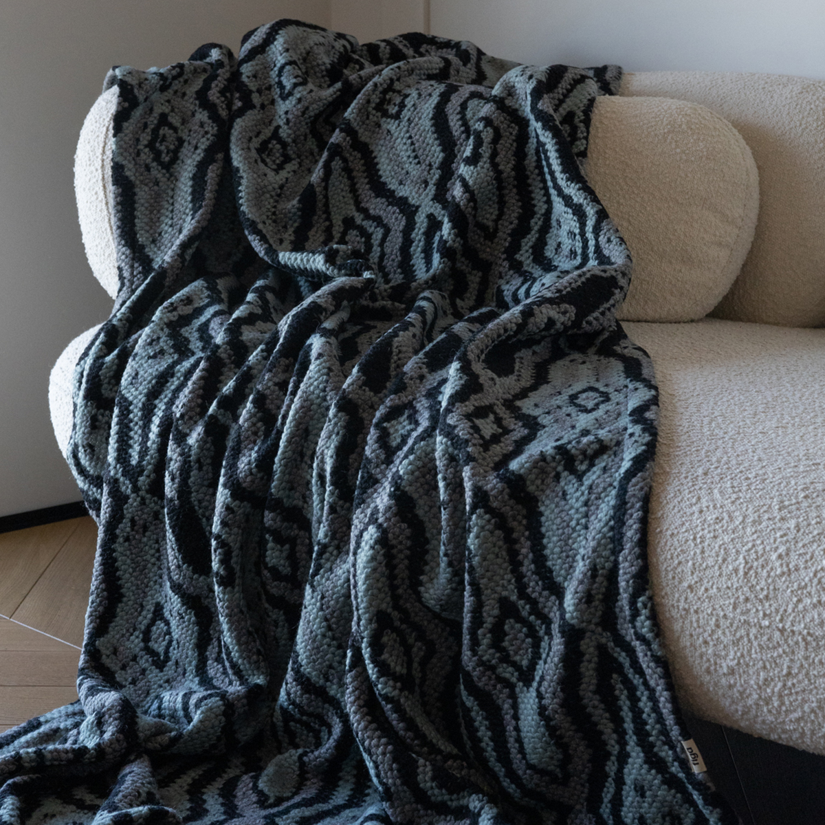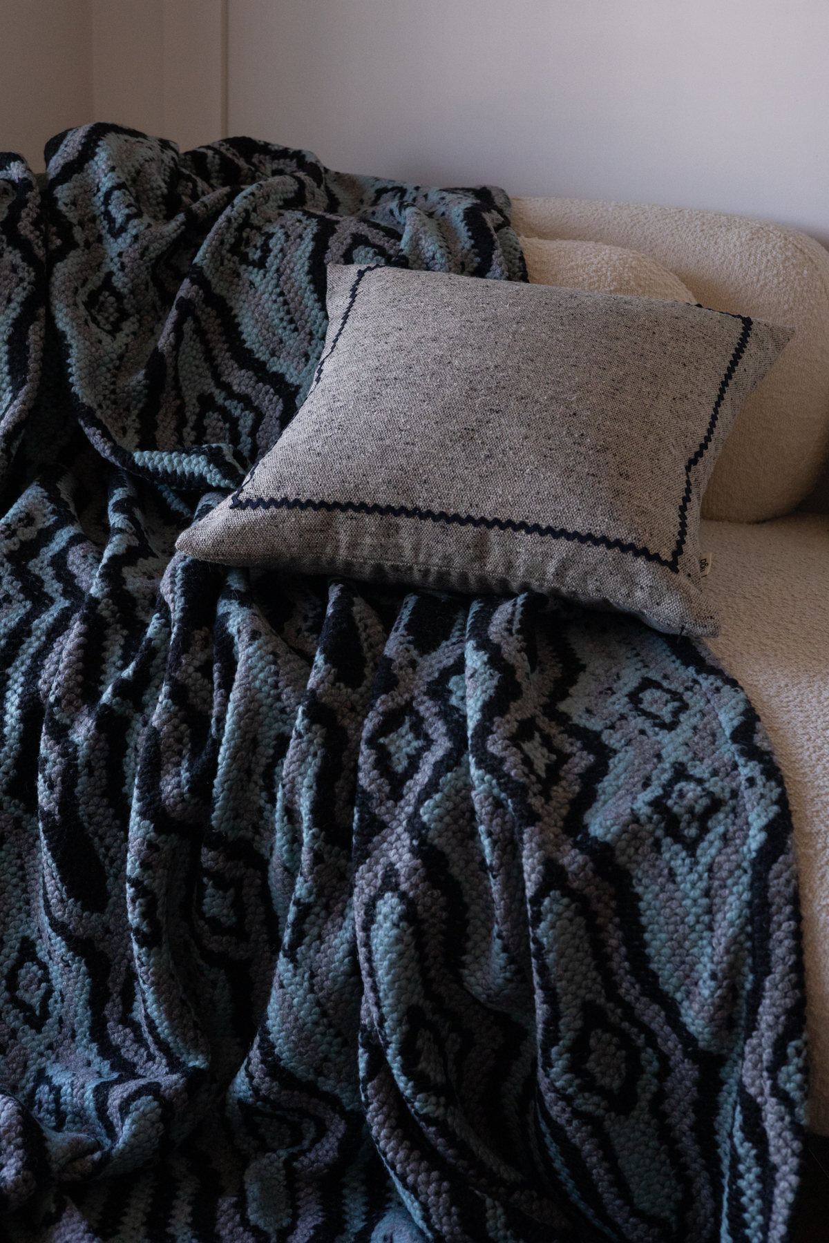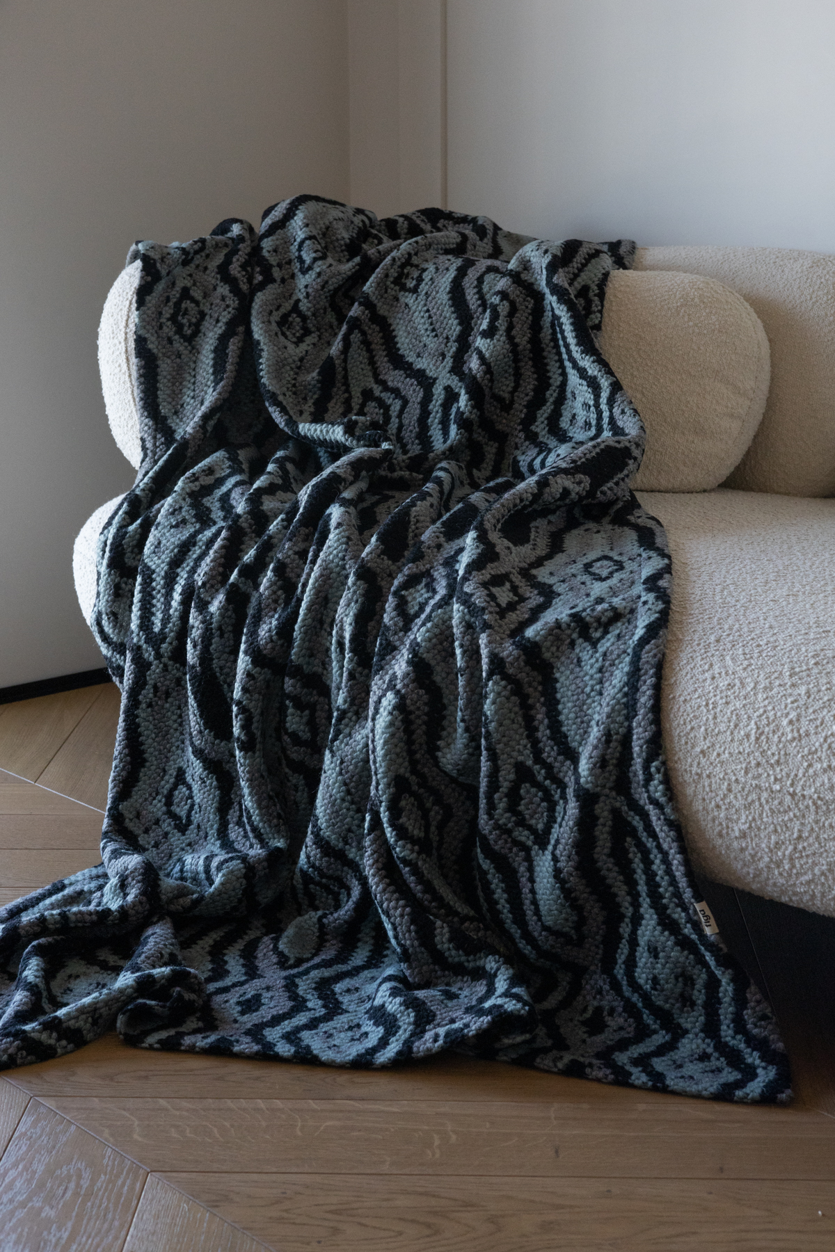 Koc z miękkiej dzianiny wełnianej. Przyjemny w dotyku pled w odcieniach morskiego, czerni i szarości. Stylowa narzuta wełniana do salonu lub sypialni.